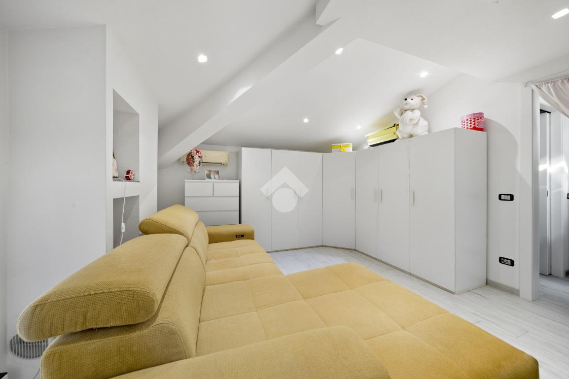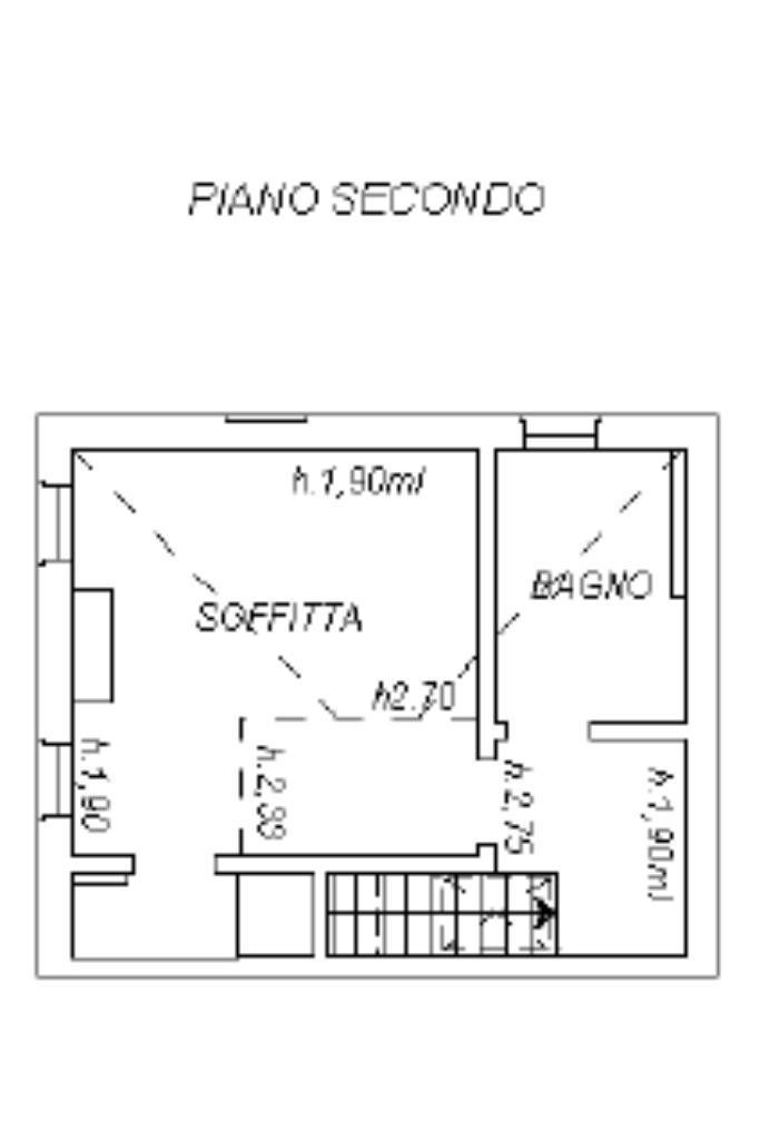 Al secondo piano ospita un’ambiente mansardato composto da una cameretta con una cabina armadio e un ulteriore bagno.