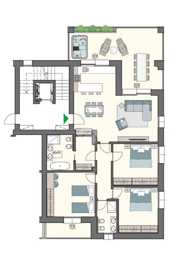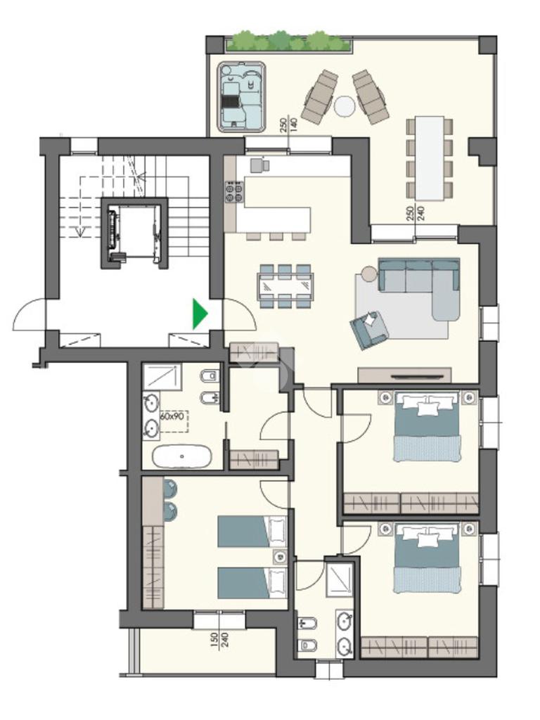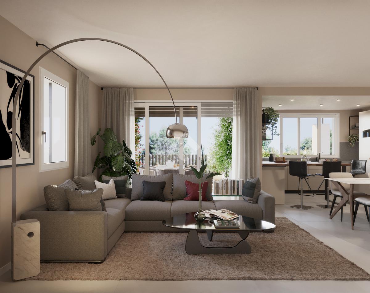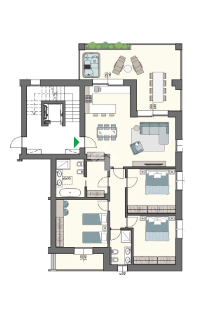 Questo quadrilocale si compone di ingresso su soggiorno open space con angolo cottura di circa 37 mq, terrazzo loggiato di 32 mq, disimpegno, tre camere da letto matrimoniali di cui una con balcone, 2 bagni + lavanderia.