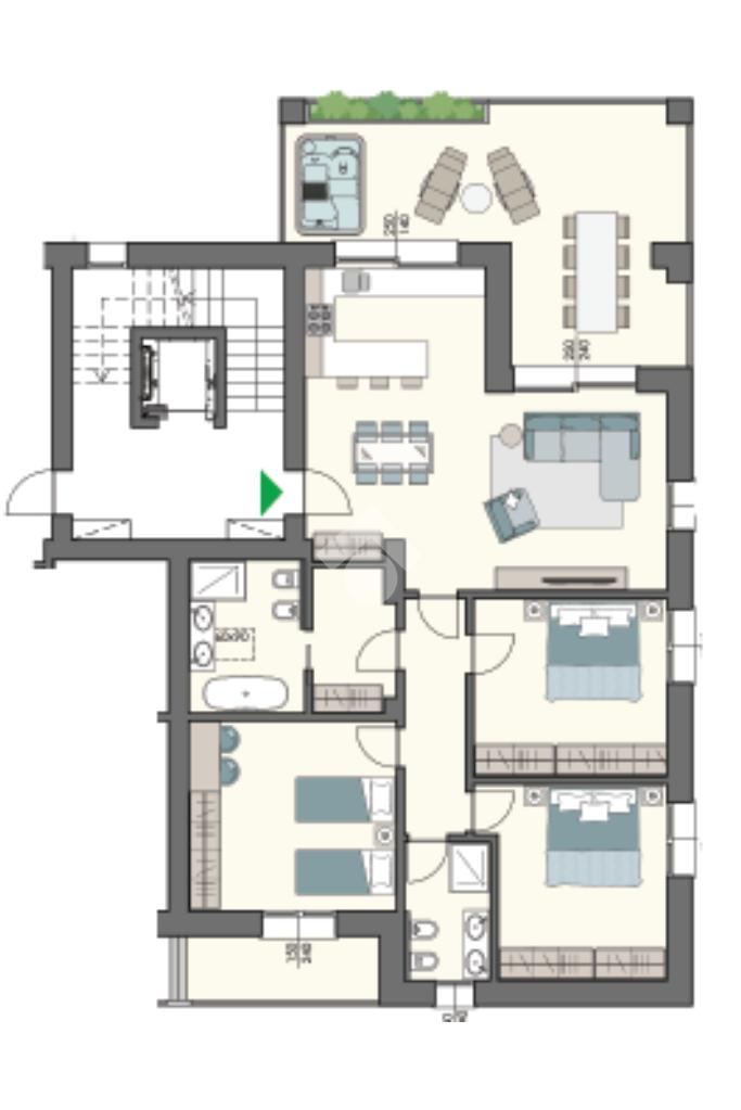 Questo quadrilocale si compone di ingresso su soggiorno open space con angolo cottura di circa 37 mq, terrazzo loggiato di 32 mq, disimpegno, tre camere da letto matrimoniali di cui una con balcone, 2 bagni + lavanderia.
