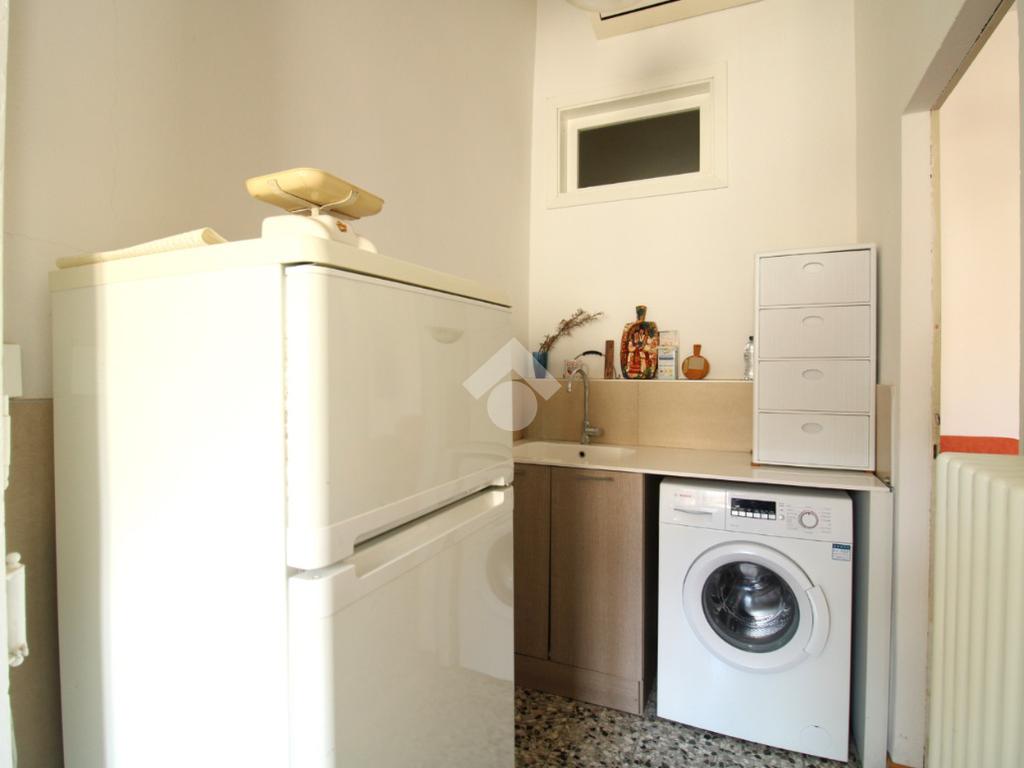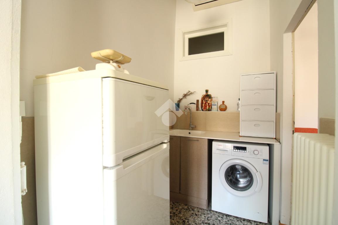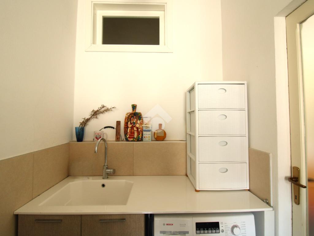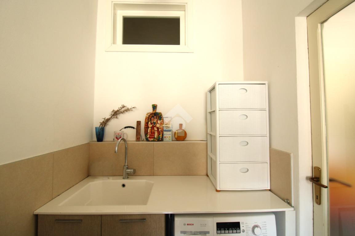 L’ingresso, dotato di porta blindata installata nel 2018, conduce alla zona giorno composta da soggiorno e lavanderia, dalla quale si accede alla cucina. La cucina dispone di accesso diretto a un terrazzino.
