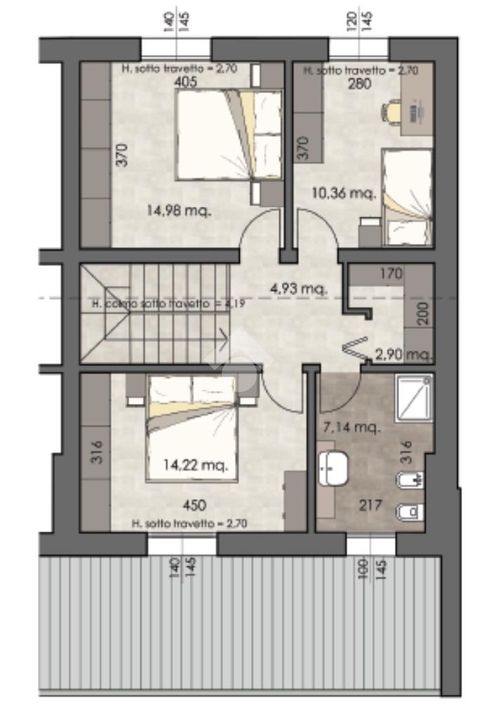 La soluzione gode al piano terra di ingresso su cucina e soggiorno open space di circa 42 mq e bagno. Al piano primo troviamo tre camere da letto, ripostiglio, disimpegno e bagno.