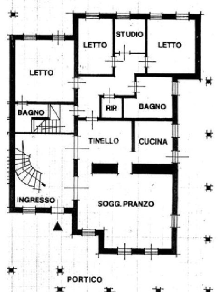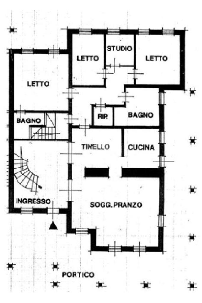 Al piano terra: ingresso su ampio disimpegno con importante scala in legno, soggiorno con camino in marmo, cucina abitabile con dispensa, bagno padronale con vasca, tre camere da letto di cui una con ampio balcone e bagno in camera.