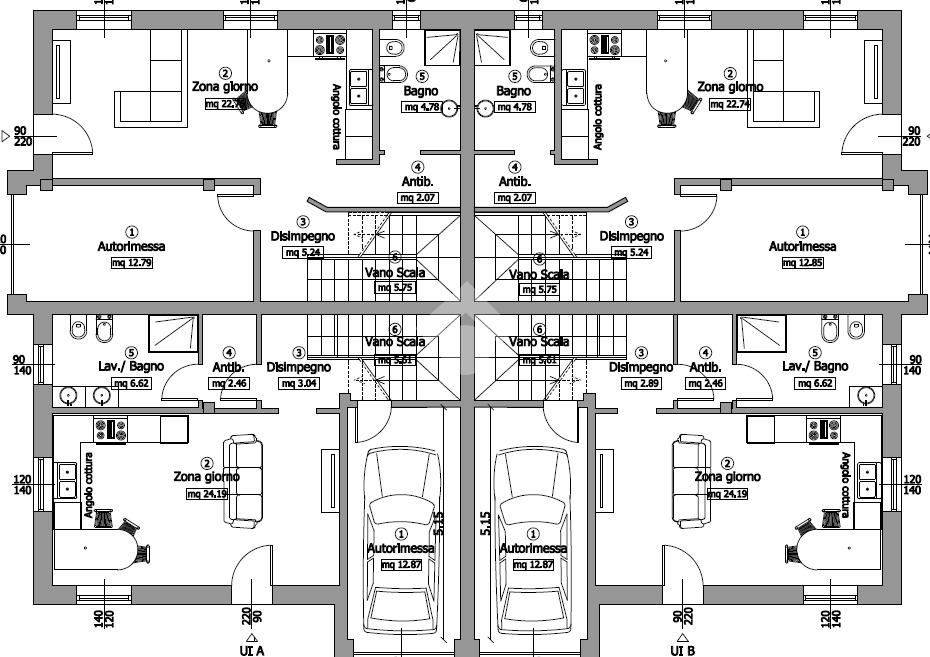 E' composta da: ingresso in soggiorno con angolo cottura, ampio disimpegno, antibagno, bagno e garage singolo. Al primo piano: disimpegno notte, due camere da letto singole, una camera da letto matrimoniale ed il bagno con doccia.